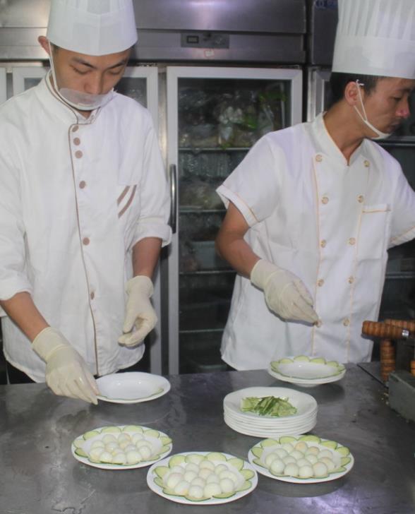 串菜服務(wù)員,著工裝、戴手套、微笑透明口罩 、專用圍腰,才能進(jìn)行工作。