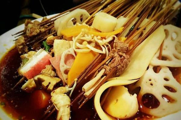 串串香色澤鮮艷,營養豐富。明亮的淡黃色的腐竹,翠綠的蔬菜,黑色的海帶、木耳,白色的蘑菇……